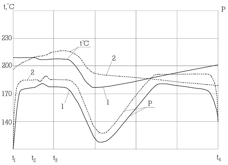 Рис. 1. Зависимость расхода мощности и температуры смеси от времени перемешивания: 1 – лабораторной мешалке; 2 – на смесителе Д-597; t1 – начало введения минерального материала; t2 – начало введения вяжущего; t3 – начало введения инициатора окисления; t4 – выгрузка смеси