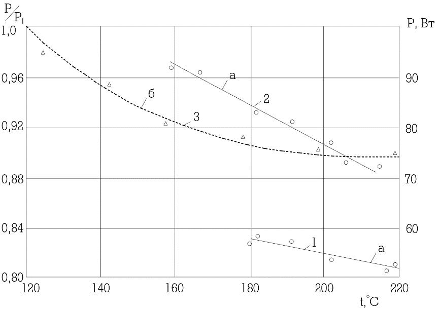 Рис. 2. Зависимость расхода мощности от температуры смеси: а – на лабораторной мешалке; б – на смесителе Д-597; 1,3 – до ввода инициатора процесса; 2 – после ввода инициатора процесса
