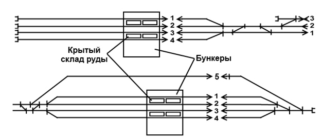 Станция выгрузки (Рис. 1) предназначена для приема и отправления технологических поездов, их оборота, производства выгрузки думпкаров. На станции располагается бункер для приема руды, обычно в здании. Выгрузка может производиться со всех путей станции или с части путей, если бункеры оборудованы не при каждом пути станции. Благодаря возможности оборота поездов без обгона локомотива, такие станции часто строятся конечными тупикового типа. Ввиду ограниченности длины станционных площадок в пунктах приема руды на станциях выгрузки целесообразно применять стрелочные переводы специальных конструкций [8, 9].