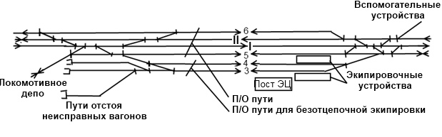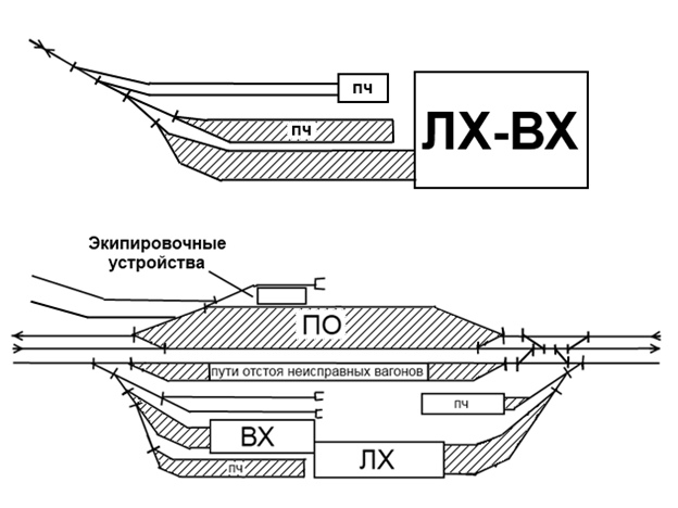 Локомотиво-вагонное депо – предназначено для отстоя и ремонта промышленных локомотивов и вагонов технологических поездов, как правило, появляется позже первой очереди строительства ППЖТ, на определенной стадии развития совмещенное депо передается под ремонт только вагонов, а на новой территории строится отдельное депо, специализирующееся на ремонте локомотивов. Большинство путей заходят в крытый ангар депо (Рис. 2). Станция зачастую тупикового типа.