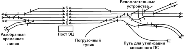 Пост примыкания (Рис. 5) служит для соединения двух линий карьерной железнодорожных при отсутствии необходимости строительства станции. Обустраивается в местах соединения линий с малыми поездопотоками, а также в местах примыкания погрузочных путей с незначительными размерами движения заходящих под погрузку поездов.