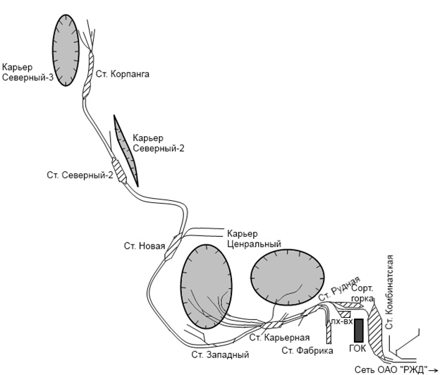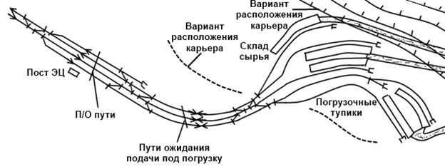 На основе этих типов раздельных пунктов обустраивается сеть карьерной железной дороги, которая может иметь разную структуру в зависимости от географических особенностей местности [11]: