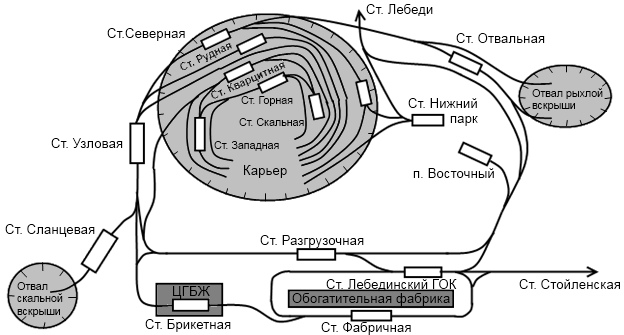 ППЖТ играют важную роль в работе сети железных дорог, они предназначены для обработки прибывших с внешней сети составов, их выгрузки, формирования, обслуживания, погрузки и отправляющихся составов вновь на общую сеть [1, 2]. Назначения у ППЖТ встречаются самые разнообразные – заводские, карьерные, логистические и т.д. [3]. Проектирование и строительство очередей горнообогатительного комбината, сети карьерной железнодорожной сети и разработка непосредственно карьера – это сложные взаимосвязанные процессы, занимающие несколько десятилетий, начиная с геологической разведки местности задолго до строительства комбината и заканчивая моментом добычи последней тонной руды.