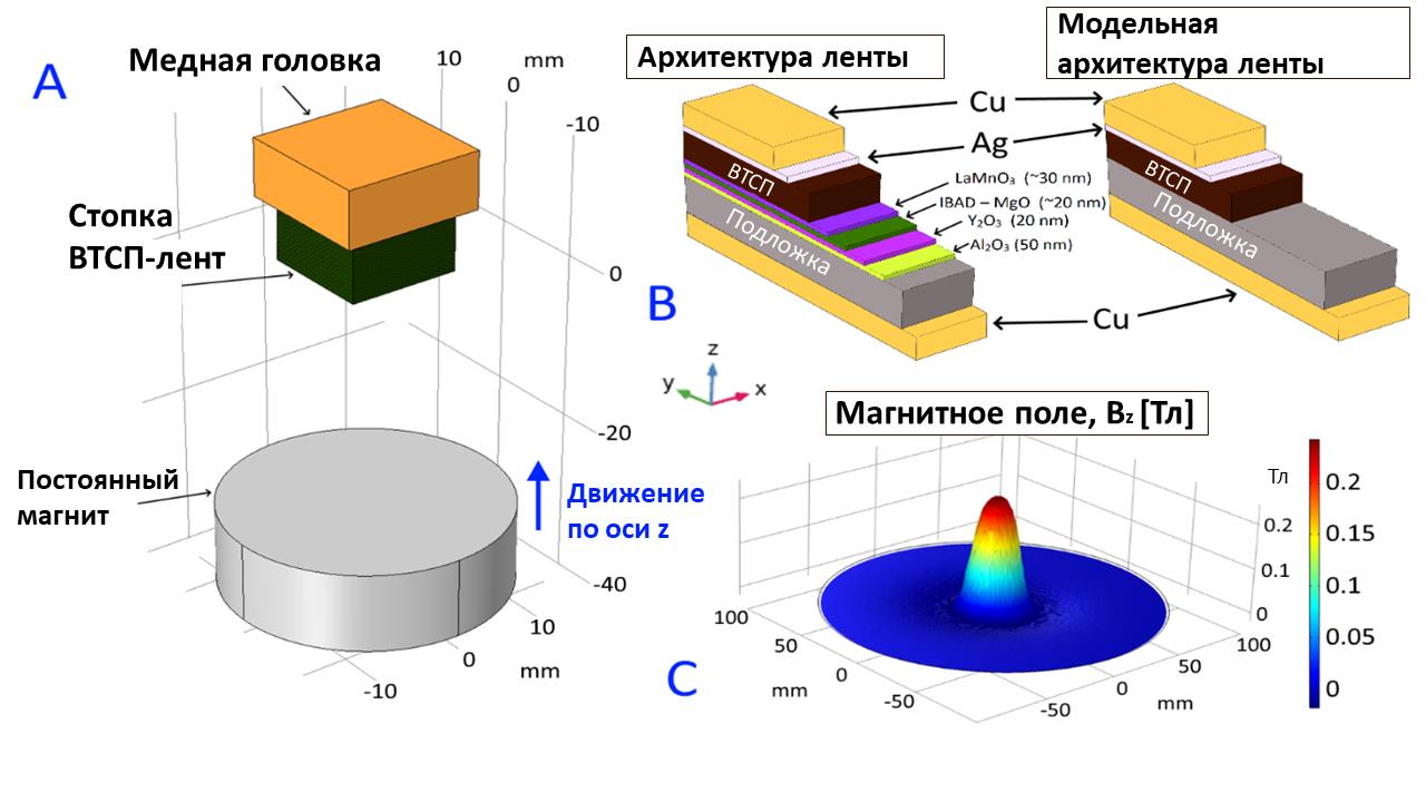 В рамках представленной работы рассмотрены две системы охлаждения намагничиваемой в поле постоянного магнита стопки ВТСП лент: криокулерное охлаждение и охлаждение жидким азотом. При использовании криокулера охлаждение происходит, как правило, с одной стороны стопки, примыкающей к холодной головке криокулера. В случае использования жидкого азота охлаждение осуществляется по всему периметру стопки, помещенной в жидкий азот. Базовая геометрия криоохлаждаемой системы левитации показана на Рис. 1А. В этом случае слоистая стопка ВТСП-лент (Рис. 1Б) располагается в горизонтальной плоскости xy и размещается на медной головке криокулера. Постоянный магнит, распределение магнитного поля которого показано на Рис. 1С, перемещается вдоль вертикальной оси z. При намагничивании магнит приближается к стопке ВТСП лент с расстояния 30 см до высоты 7 мм над поверхностью стопки, а затем вновь отдаляется от нее на то же расстояние. Таким образом имитируется режим охлаждения в нулевом поле (zero field cooling – ZFC). Намагничивание стопки ВТСП лент выполняется при температуре 77,4 К для обоих вариантов охлаждения (криокулер, жидкий азот). Скорость ввода магнитного поля при намагничивании варьировалась от 0,05 до 30 Тл/с посредством изменения времени подвода и отвода постоянного магнита. На практике такие условия могут быть реализованы либо при сильных скачках магнитного поля, либо при импульсном намагничивании стопки лент.