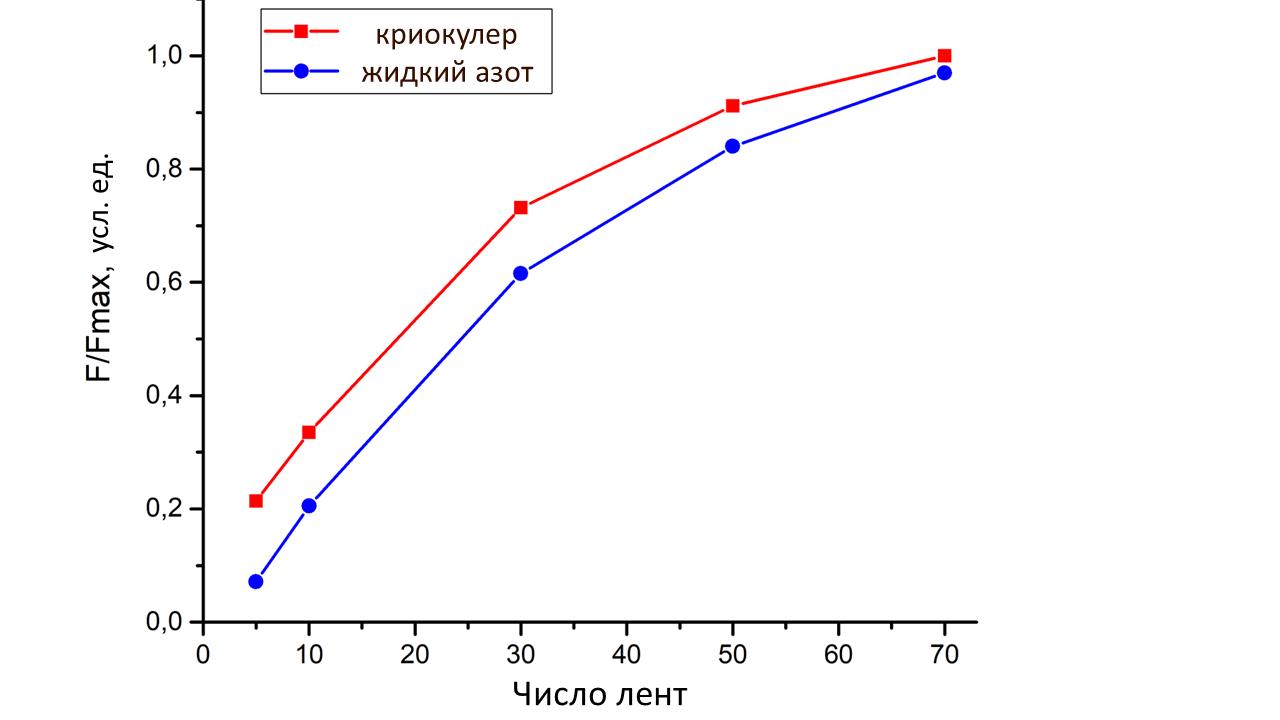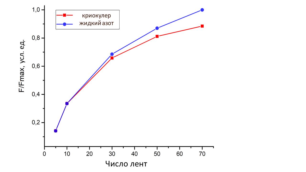 Перейдем к рассмотрению влияния системы охлаждения на левитационные свойства стопок ВТСП-лент. На Рис. 2 приведены зависимости максимальной силы левитации от числа лент в стопке для криокулерного охлаждения до температуры 77,4 К и азотного охлаждения при скорости намагничивания 0,05 Тл/с. Видно, что при высоте стопки менее 30 шт. лент сила левитации при охлаждении обоими способами практически совпадает. При дальнейшем увеличении высоты стопки, слои, наиболее отдаленные от холодной головки криокулера начинают нагреваться сильнее, что отрицательно сказывается на захвате магнитного потока и силе левитации. С этой точки зрения азотное охлаждение, выполняемое по всему периметру стопки, при низкой скорости изменения магнитного поля и высоких критических токах оказывается выгоднее.