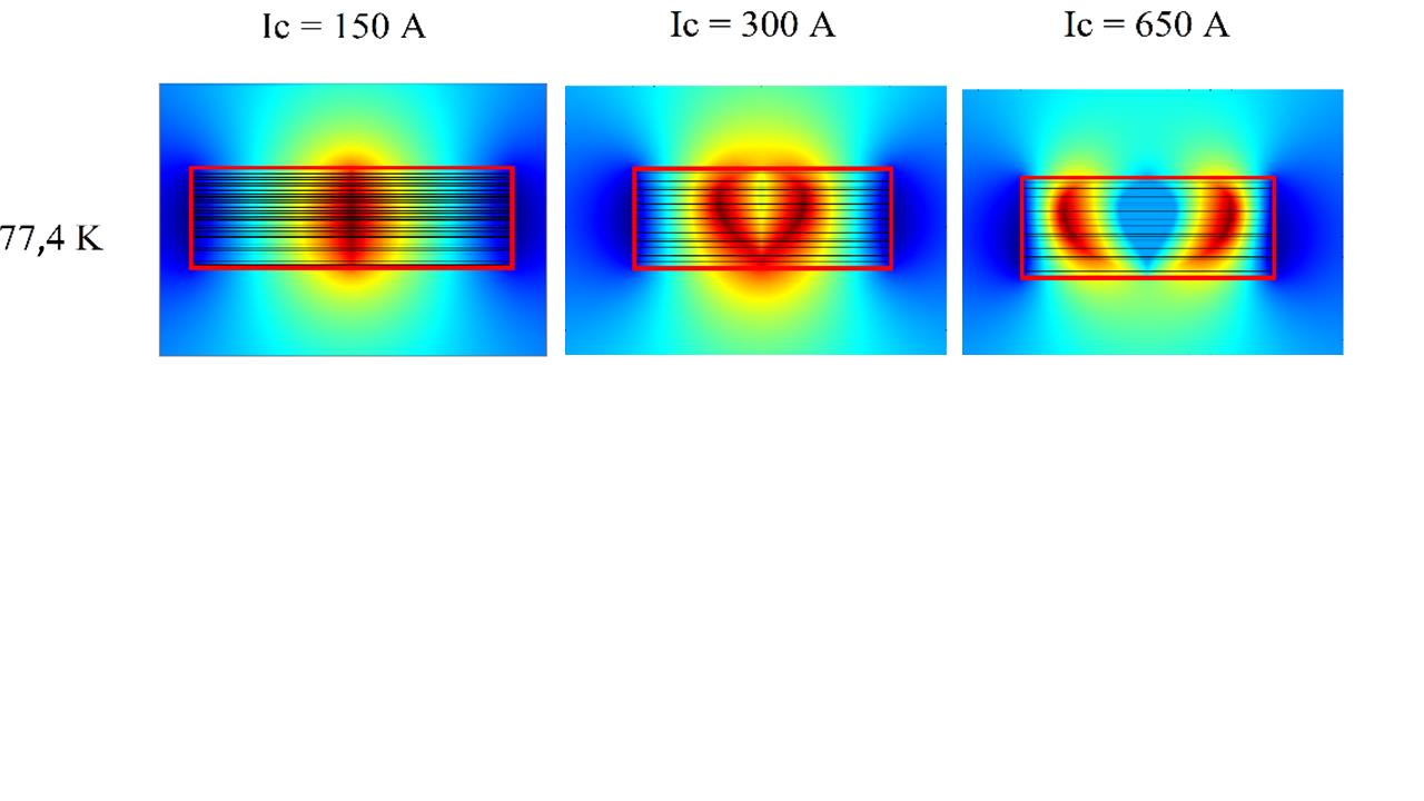 Для того, чтобы объяснить низкую эффективность криокулерного охлаждения высоких (>30 лент) стопок было рассчитано распределение захваченного магнитного потока стопкой 50 ВТСП лент с различным критическим током при охлаждении криокулером до температуры 77,4 К (скорость ввода магнитного поля 0,05 Тл/с). Ввиду особенностей экранировки дальних слоев стопки ближними уже при температуре 77,4 К, стопки с более высоким критическим током не намагничены полностью. Это приводит к снижению эффективности захвата магнитного потока и уменьшению силы левитации при увеличении числа лент в стопке.