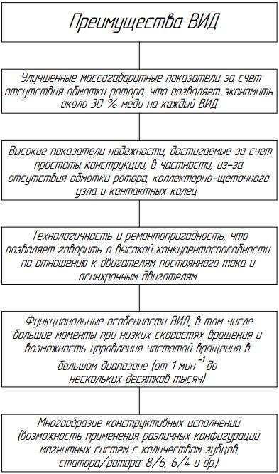 Вентильно-индукторные двигатели обладают более высоким КПД по сравнению с применяемыми в настоящее время асинхронными и коллекторными электродвигателями. Поэтому интенсивное изучение, анализ, модернизация конструкции и улучшение технико-экономических показателей являются актуальными задачами. Помимо высокого КПД вентильно-индукторные двигатели (ВИД) обладают следующими существенными преимуществами, представленными на Рис. 1 [1].