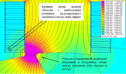 Суть рассматриваемых физических процессов. Витки в обмотке статора изолированы друг от друга, а так как теплопроводность меди на порядок превышает теплопроводность изоляции, то изоляция витков, прилегающая к медному проводнику обмотки, подвергается значительному перегреву. Такая особенность характерна при работе тягового двигателя НТИ-350. Перегрев характерен для витков, расположенных с набегающей части ротора, где наблюдается повышенная плотность магнитного потока [2]. Когда зубцы ротора начинают перекрывать зубцы статора (стремятся к согласованному положению), будет наблюдаться резкое увеличение индуктивности фазы и сцепленного с ней магнитного потока, который «выпучивается» наружу по отношению к магнитной системе. Данный эффект характерен именно для тяговых ВИД и ВИД средней и большой мощности, где медные обмотки наматываются на ребро. Магнитное поле проникает в эту плоскую грань, вызывая дополнительные потери.