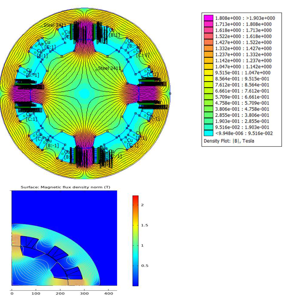 Для оценки достоверности полученных результатов приведем сравнение распределения магнитного поля ВИД конфигурации 12/8, полученного в программе «FEMM» (Рис. 6а, Рис. 7а) и распределения магнитного поля сектора ВИД, построенного в ПП «COMSOL Multiphysics» (Рис. 6б, Рис. 7б) [19].