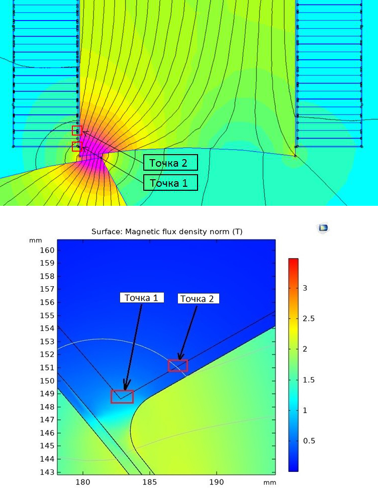 Анализируя Рис. 6, Рис. 7, приходим к выводу о том, что картина распределения магнитного поля ВИД, полученная в программе «FEMM», аналогична картине распределения магнитного поля сектора ВИД, полученной в ПП «COMSOL Multiphysics». Значения магнитной индукции в точке 1, рассчитанные в программе «FEMM» и в ПП «COMSOL Multiphysics» (|B1| = 0,634 Тл, |B3| = 0,678 Тл), значительно превосходят значения магнитной индукции в точке 2 (|B2| = 0,371 Тл, |B4| = 0,360 Тл), что наглядно показывает наличие скин-эффекта.