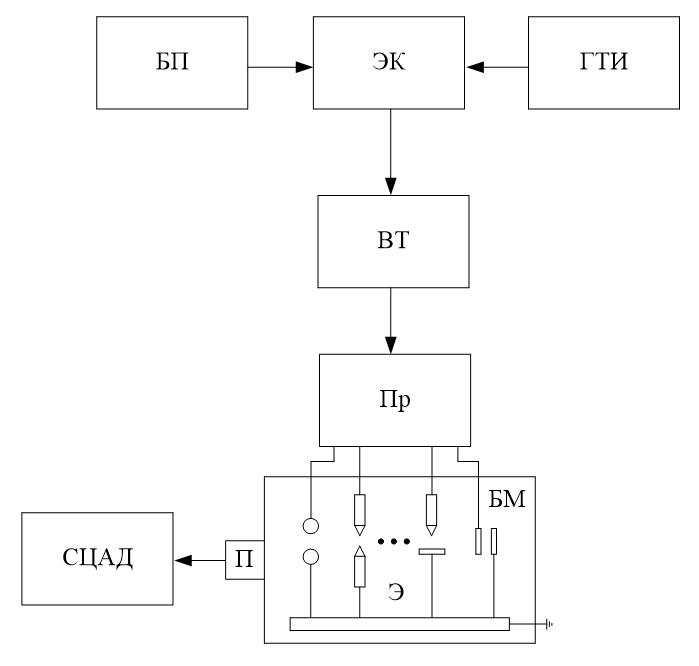 БП – блок питания; ЭК – электронный коммутатор; ГТИ – генератор тактовых импульсов; ВТ – высоковольтный трансформатор; СЦАД – система цифровая акустико-эмиссионная диагностическая; П – преобразователь акустический; Пр – переключатель;