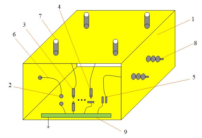 1 – корпус маслонаполненного бака; 2, 3, 4, 5 – электроды, имитирующие различные дефекты; 6 – провод; 7 – преобразователь акустический; 8 – изолятор; 9 – шина заземления.