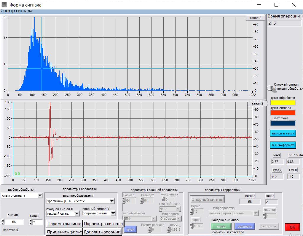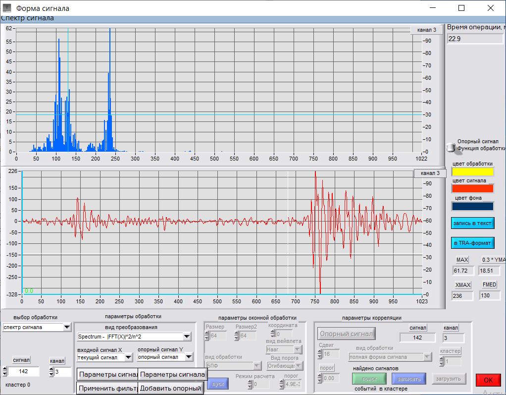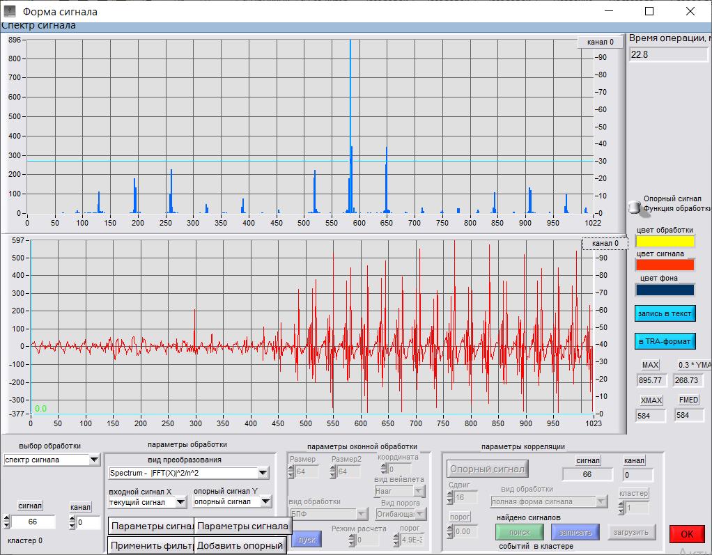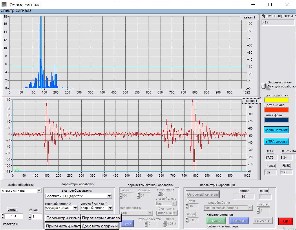 Для характеризации формы акустических сигналов в программном обеспечении была использована функция быстрого преобразования Фурье (FFT), представлено на верхних графиках Рис. 3–6. По вертикальной оси отложены амплитуды Аm, по горизонтальной – частота в кГц. На представленных спектрах выделены доминантные частоты Fд1, Fд2, Fд3.