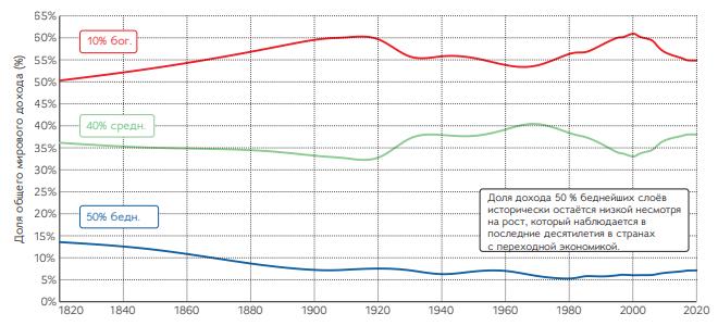 Рис. 1. Глобальное неравенство в уровнях дохода, 1820–2020 гг.