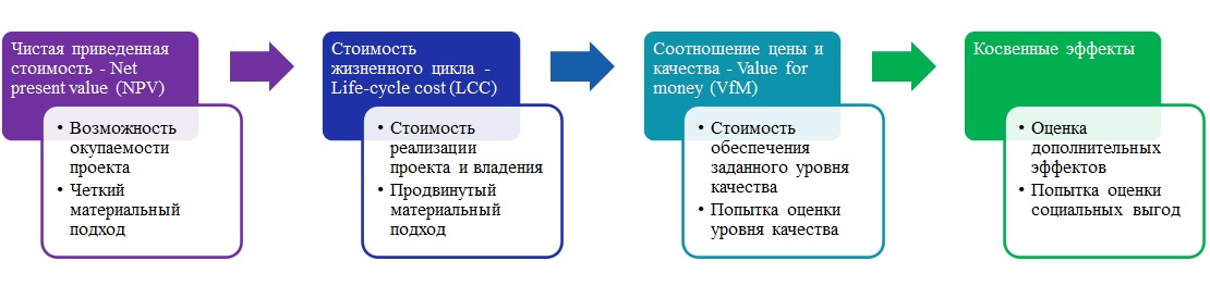 Традиционным методом оценки транспортных проектов является расчет чистой приведенной стоимости проекта (Net Present Value, NPV) и ориентирован на инвесторов. Задачей метода является сопоставление инвестиций в проект и расходов на его реализацию (в частности, на стадии эксплуатации объекта) с доходами, генерируемыми проектом. Сопоставление предполагает приведение разновременных денежных потоков к единой точке отсчета и учет временной стоимости денег – возможностей альтернативного инвестирования и платы за риск.