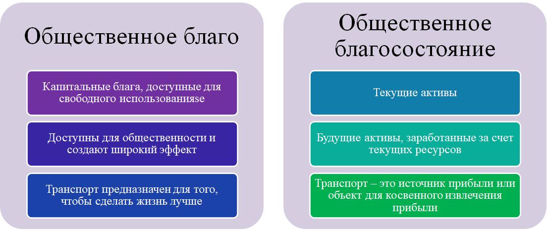 В отношении категории «общественное благо» необходимо отметить, что это спорная экономическая категория, но ее наличие не обусловлено обстоятельствами. Общественное благо больше относится к нематериальному образу мышления, в то время как общественное благосостояние – к материальному. Общественное благосостояние апеллирует к финансовой выгоде, где транспорт является одним из инструментов для извлечения прибыли. Общественные блага, напротив, – это полезные услуги, которые порождают объемный эффект, затрагивающий различные сферы социальной жизни [12]. И в данном случае транспорт как идея, прежде всего, является инструментом улучшения качества жизни широких масс (Рис. 5).