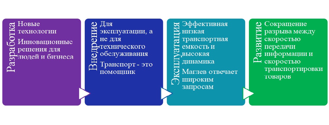 В качестве примера комплексной оценки транспортных проектов приводится магнитолевитационный транспорт, который отвечает современным вызовам, стоящим перед экономикой и обществом: максимизация полезной функции транспорта; ресурсно-ориентированная эффективность [13, 14]. Технология маглев способна вернуть транспорту свою первоначальную роль в экономике – как обслуживающего элемента. У магнитолевитационного транспорта есть возможности для удовлетворения спроса на услуги по перевозке со стороны различных групп потребителей и бизнеса. Кроме того, транспортировка посредством маглев может сделать диспропорцию между скоростью обмена информацией и скоростью транспортировки менее ощутимой (Рис. 6).