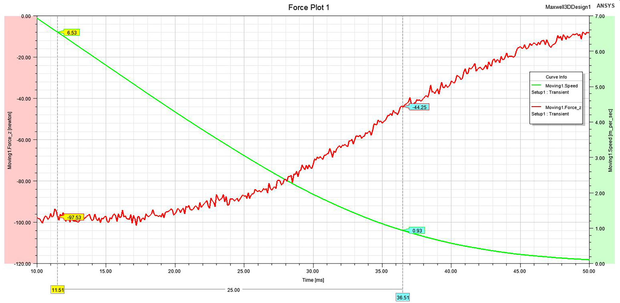 - Для практического использования наибольший интерес представляют графики тормозящего усилия, которое приводит к падению скорости движения элементов домена Magnet (Рис. 5, 6). Данные результаты позволяют в дальнейшем получить зависимости суммарного тормозного усилия магнитной сборки от относительной скорости движения, что в свою очередь позволяет рассчитать динамику торможения юнимобиля с помощью ВТЗ, спроектированного на базе рассчитанных магнитов и шины [16, 17].