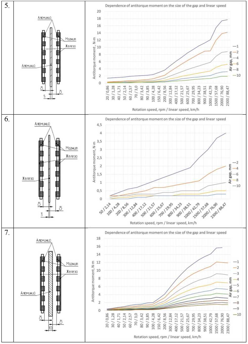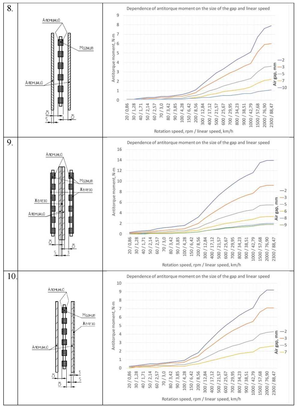 В ходе работы установлены зависимости величины тормозной силы от используемых материалов, конструктива, скоростей, зазоров, температуры и др. параметров для тестовых образцов с оценкой более 10 различных вариантов компоновки магнитной системы (Рис. 2).