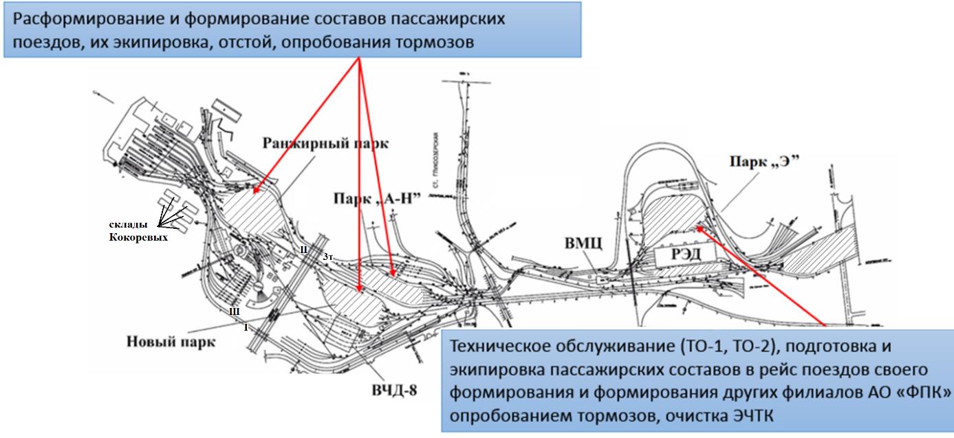 Технологии обслуживания составов пассажирских поездов дальнего следования  | существующая  | изменение технологии работы «Ранжирного» и «Нового» парков и сосредоточению практически всей работы по подготовке составов в рейс в парках «Э» и в «А-Н»  | |