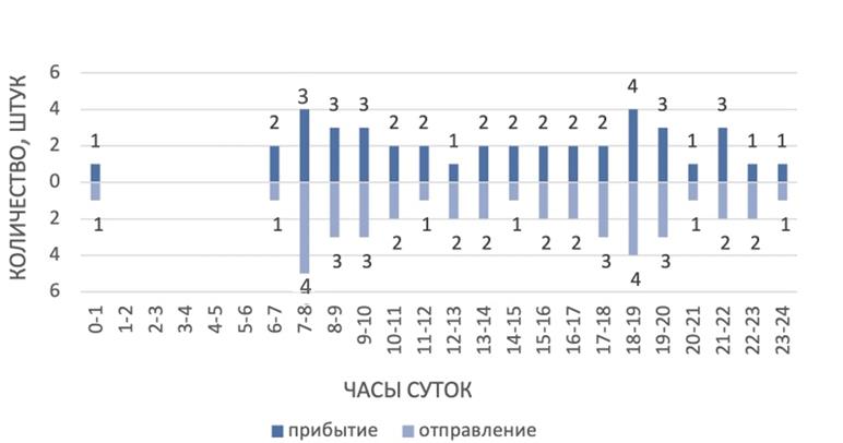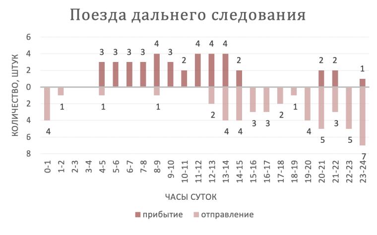 Рис. 3. Распределение прибытия и отправления дальних поездов по часам суток
