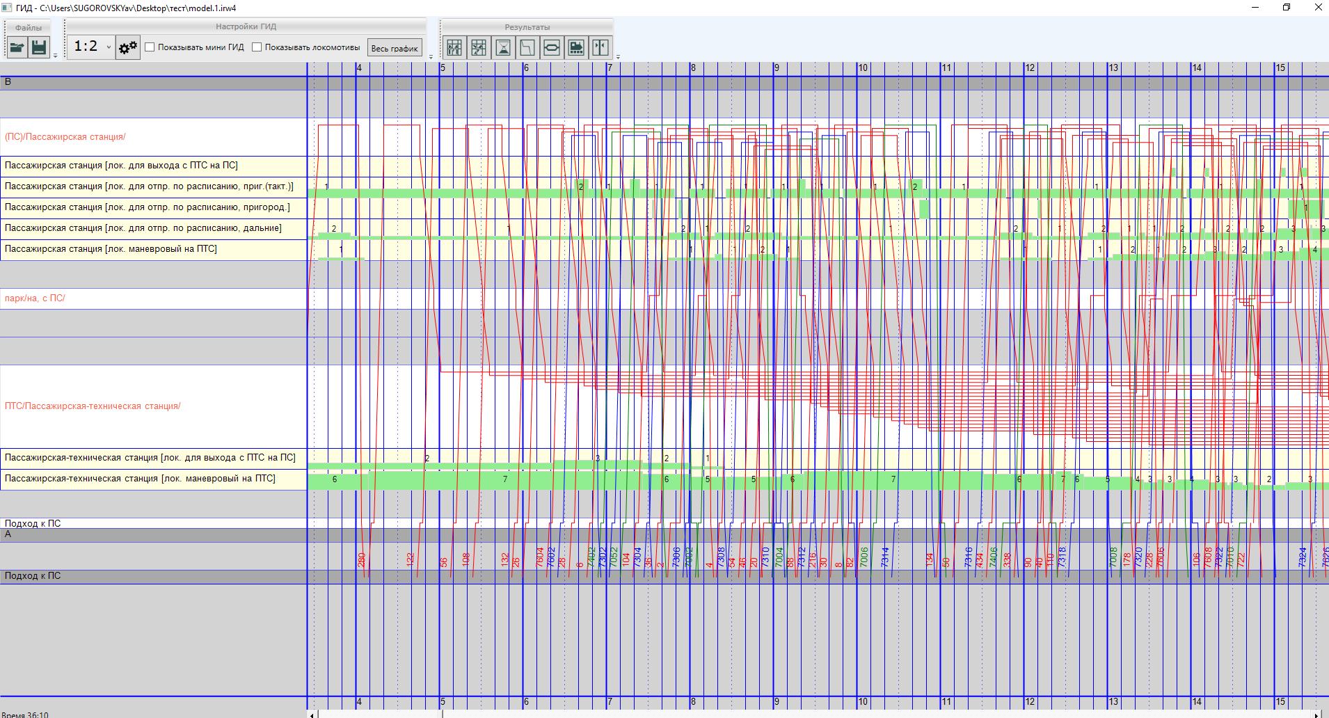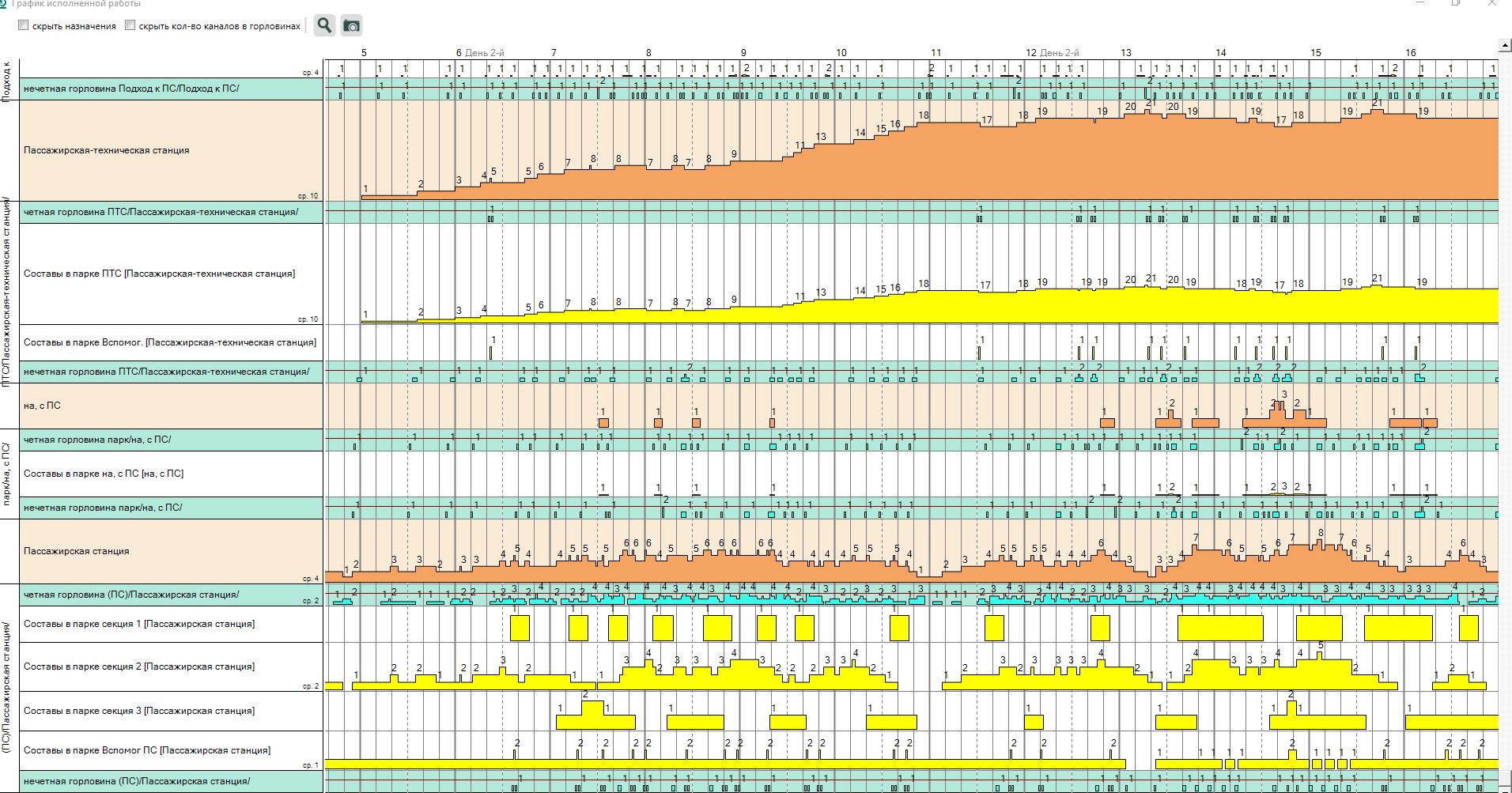 Рис. 4. Фрагмент графика исполненной работы транспортной системы станции Санкт-Петербург-Главный, моделируемого в программе ИМЕТРА