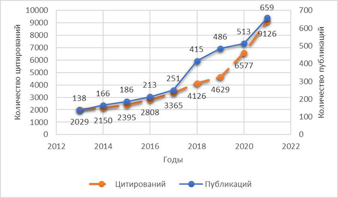Научные исследования по этой тематике проводятся как в России, так и за рубежом, рынок экспресс-доставки рассматриваются как важная часть рынка транспортно-логистических услуг. Нами выполнен анализ количества публикаций по теме Express Delivery относящихся к логистике за последние 8 лет, размещенных в базах данных Scopus и Web of Science. Отмечается явный тренд роста интереса к данной теме, количество публикаций с 2013 по 2021 годы увеличилось более чем в пять раз, аналогичный тренд показывает и количество цитирований (Рис. 1).