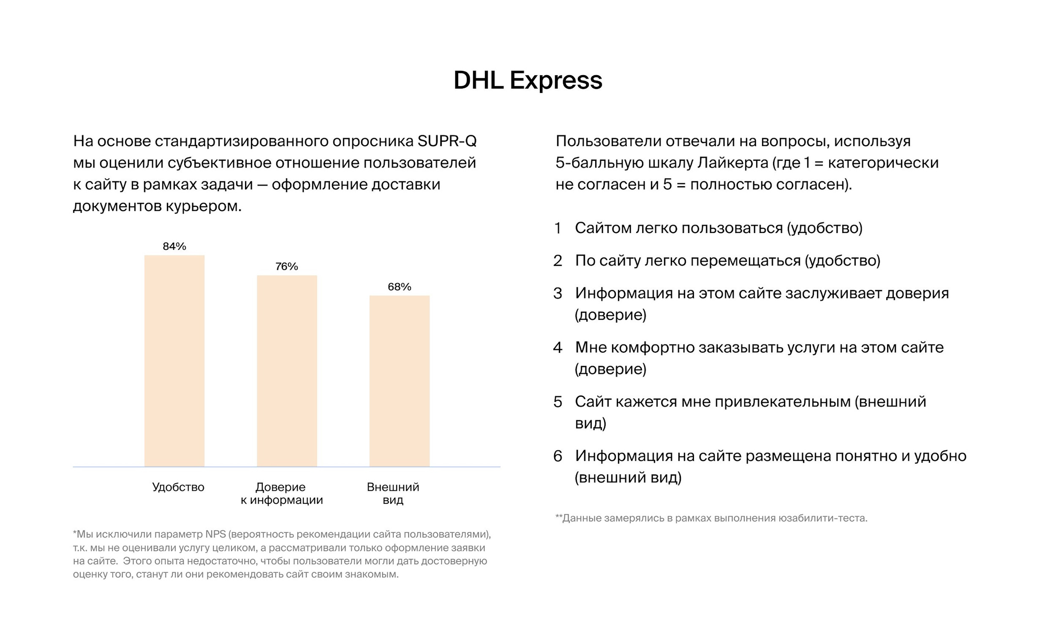Для максимизации полезности полученного в ходе тестирования результата мы добавили опрос субъективной удовлетворенности пользователя сайтом для выполнения заказа на основе анкеты SUPR-Q, которую адаптировали под наше исследование. Анкета SUPR-Q (Standardized User Experience Percentile Rank Questionnaire) используется для измерения качества пользовательского опыта на сайтах компаний [17].