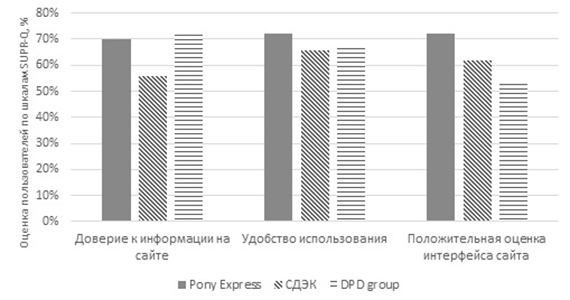 Интересно отметить, что субъективная оценка сайта СДЭК по параметрам удобства и доверия к информации коррелирует с данными по успешности выполнения задания и времени его выполнения. Наилучшие результаты по исследованным параметрам SUPR-Q у компании Pony Express, по всем трем показателям она набирает выше 70 %. Наихудшие показатели (ниже 60 %) у компании СДЭК по показателю «доверие к информации на сайте», а у компании DPD Group по показателю «оценка интерфейса сайта».