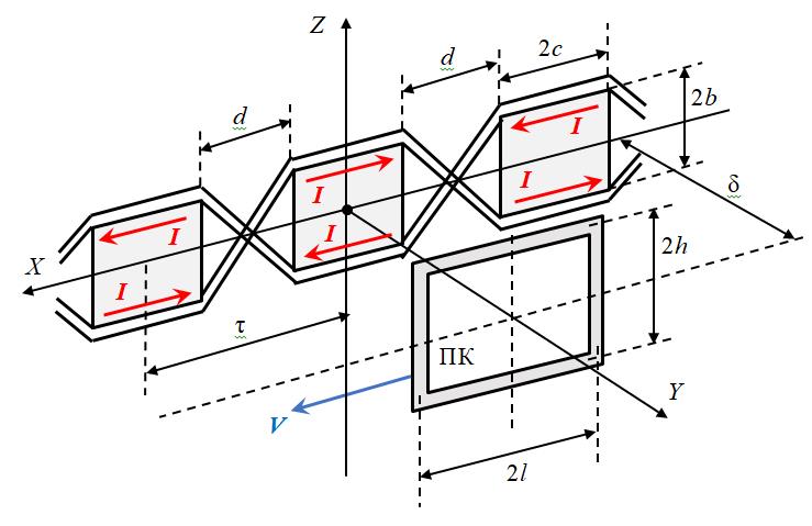 Принципиальная схема ЛГЭЭ с транспозицией проводников индуктора представлена на Рис. 1. На боковой (вертикальной) поверхности путевой эстакады размещены проводники индуктора, питаемые постоянным током от источника тока. Для уменьшения потерь энергии питание проводников индуктора должно осуществляться посекционно, по мере движения высокоскоростного экипажа. Транспозиция проводников индуктора обеспечивает изменение направления намагничивающей силы на каждом полюсном делении, благодаря чему создается переменно-полюсная магнитная система индуктора. Приемная катушка экипажа движется со скоростью V вдоль оси Х на расстоянии δ, которое представляет собой воздушный зазор между первичной (индуктор) и вторичной (приемная катушка) частями ЛГЭЭ.