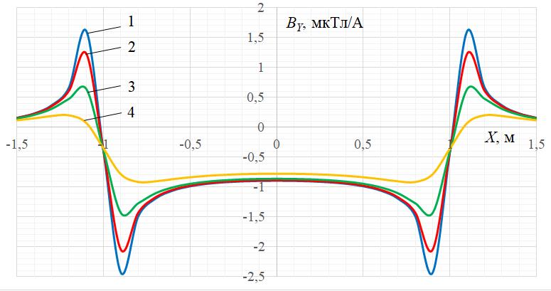 Рис. 2. Распределение Y-компоненты магнитной индукции по координате Х для уединенного токового контура при Z=0 и различных значениях воздушного зазора. 1 – δ=0,01; 2 – δ=0,05; 3 – δ=0,1; 4 – δ=0,2