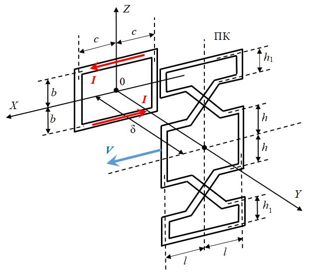 В выражении (3) первое слагаемое соответствует магнитному потоку, который пронизывает основную часть контура ПК размером 2lX2h, а второе слагаемое – магнитному потоку, пронизывающему "добавочные" контуры ПК размером 2lX2h1, если ПК экипажа имеет двойную 8-образную форму.