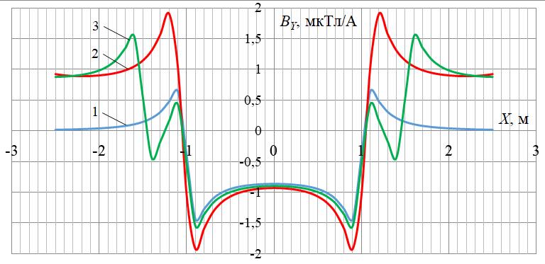 В дальнейшем будем рассматривать Y-компоненту магнитной индукции в расчете на единицу намагничивающей силы контура индуктора, тогда выражение (1) примет вид: