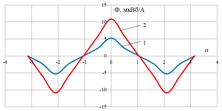 На Рис. 5 приведены кривые изменения результирующего магнитного потока , определенного по выражению (3), в зависимости от относительного смещения для ПК, имеющих прямоугольную и двойную 8-образную форму при следующих геометрических размерах: