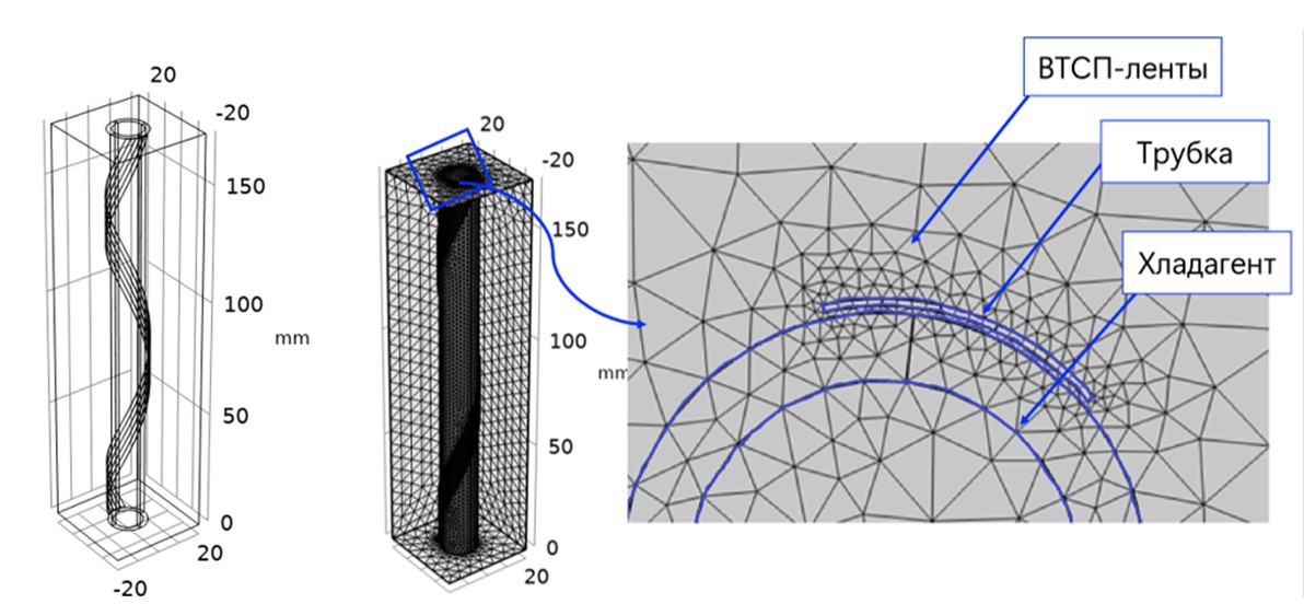 Рис. 2. Исследуемый образец: слева – геометрия CORC-кабеля; справа – конечно-элементная сетка кабеля с использованием многомасштабного структурирования