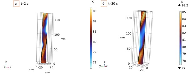 Расчет для 5 циклов нагрузки проводился в двух температурных режимах: при охлаждении жидким азотом и жидким неоном. Первоначально был проведен расчет нагрева и потерь рассеянной мощности CORC кабеля при охлаждении жидким азотом в условиях отсутствия радиационного пиннинга лент при амплитуде тока 1 кА. В начальный момент времени кабель охлажден до температуры жидкого азота, а после начала пропускания тока осуществляется прокачка жидкого азота внутри мельхиоровой трубки с коэффициентом теплопередачи 50 [W/(m2*K)]. Через 2 сек. (конец первого цикла нагрузки, когда приложенный ток равен нулю) максимальная температура системы составляет 83,3 К (Рис. 4а), что не превышает критическую температуру сверхпроводника, но приводит к снижению критического тока. Поэтому в последнем цикле нагрузки в момент времени t = 20 сек. максимальная температура составляет 93 К (Рис. 4б), что превышает критическую температуру ВТСП лент.