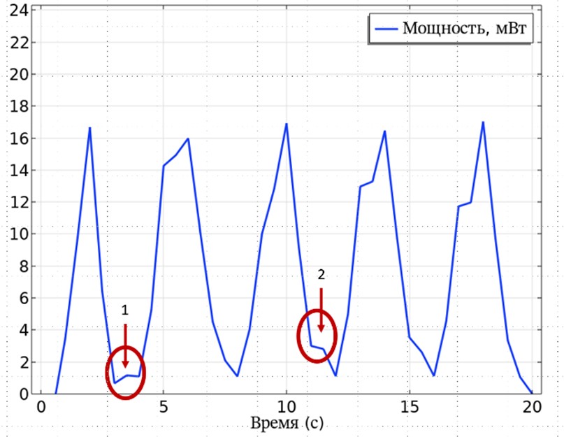Рассмотрим зависимости рассеянной мощности кабели при приложении токовой нагрузки в 5 циклах (Рис. 5). В момент времени, соответствующий максимальной амплитуде тока, тепловыделение также максимально. Поскольку нагрузка реализуется циклическим образом, необходимо рассмотреть отвод тепла во время снижения нагрузки. Охлаждающая система должна полностью стабилизировать кабель для поддержания тех же нагрузочных характеристик в течение последующих циклов эксплуатации.