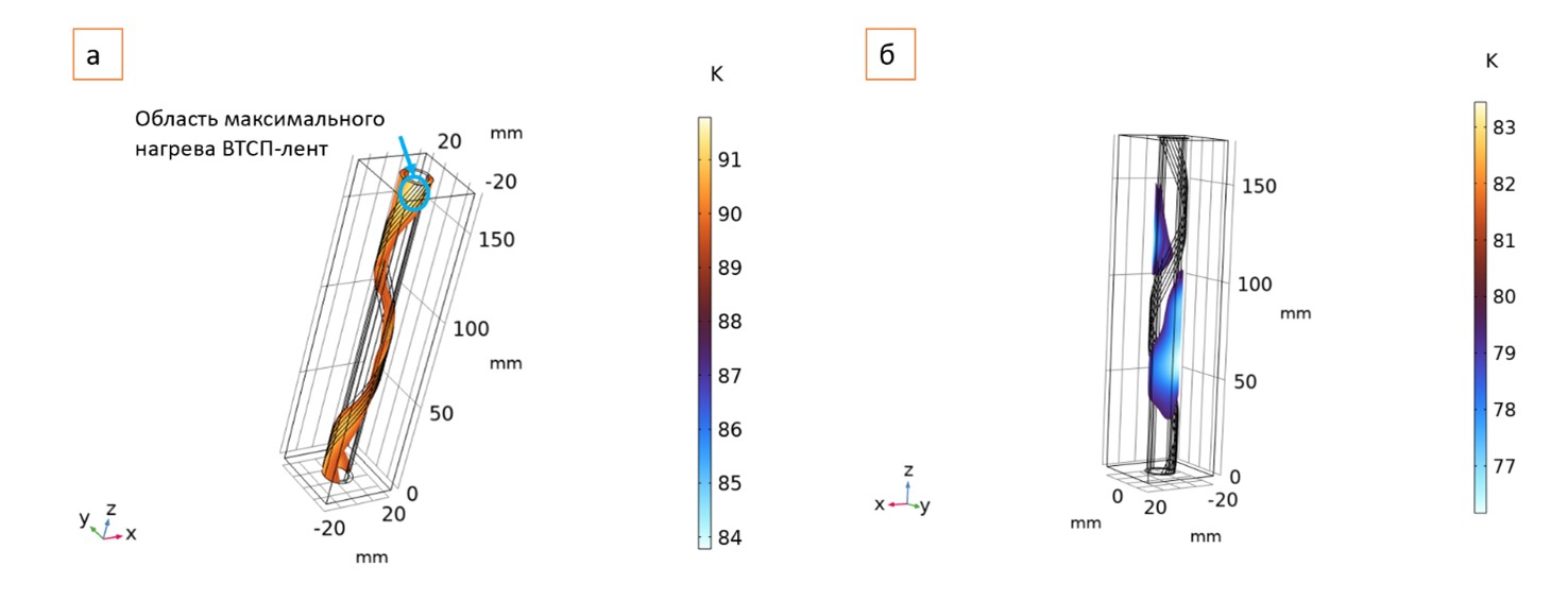 Рис. 6. Температурное распределение в CORC кабеле при амплитуде нагрузки 1кА, хладагент-жидкий азот, а-распределение температур в лентах, б-распределение наиболее «холодных» зон в мельхиоровой трубке