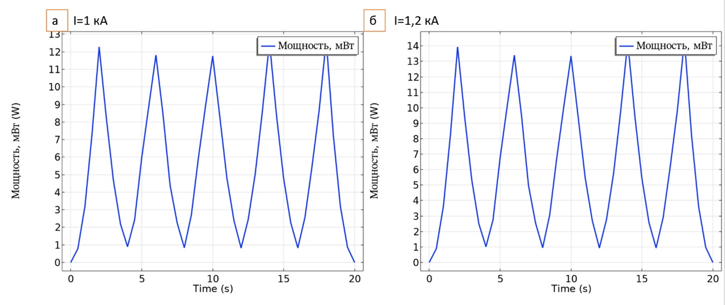Другим вариантом повышения стабильности системы является использование ВТСП элементов с более высокими критическими характеристиками. Одним из способов повышения критических характеристик ВТСП является радиационное облучение. В этом случае за счет формирования дополнительных искусственных центров пиннинга может наблюдаться повышение критического тока [11–15]. Ранее было продемонстрировано повышение критического тока облученных образцов в различных магнитных полях и проведено исследование значений энергии пиннинга. В собственном магнитном поле энергия пиннинга образцов, аналогичных представленным в настоящей работе, составляет U0 = 8 мэВ [10]. Рассмотрим транспортные и тепловые характеристики ВТСП CORC-кабеля в собственном магнитном поле с учетом эффектов радиационного пиннинга. В качестве хладагента так же, как и в предыдущем случае, выступает жидкий азот, максимальная амплитуда тока варьируется от 1 кА до 1,2 кА. Зависимости выделившейся мощности от времени для граничных случаев приведены на Рис. 7. Наличие радиационных дефектов приводит к повышению критических характеристик ВТСП, что, в свою очередь, обеспечивает тепловую стабилизацию системы, выраженные области тепловой нестабильности и свидетельства перехода лент в подкритическое состояние отсутствуют. Стабильное улучшение тепловых, и как следствие, транспортных характеристик ВТСП кабеля сохраняется во всем рассмотренном диапазоне приложенных нагрузок. Таким образом, повышение критического тока образца, связанное с наличием радиационных дефектов, позволяет кабелю находиться в стабильном тепловом режиме при длительных циклических воздействиях.