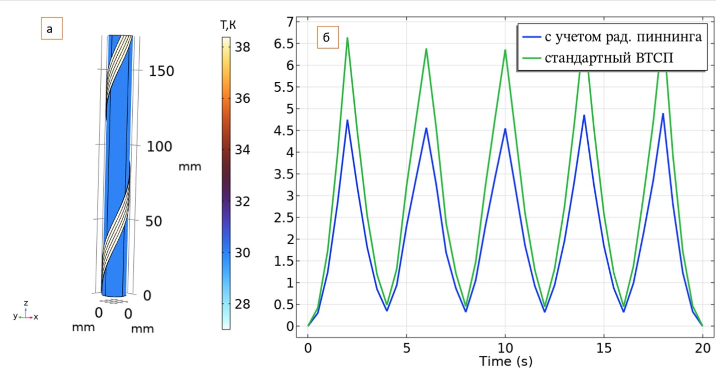 Расчетная модель, учитывающая эффект радиационного пиннинга сверхпроводника, позволяет прогнозировать параметры, при которых CORC-кабель работает в стабильном тепловом режиме и ВТСП ленты не переходят в нормальное состояние.