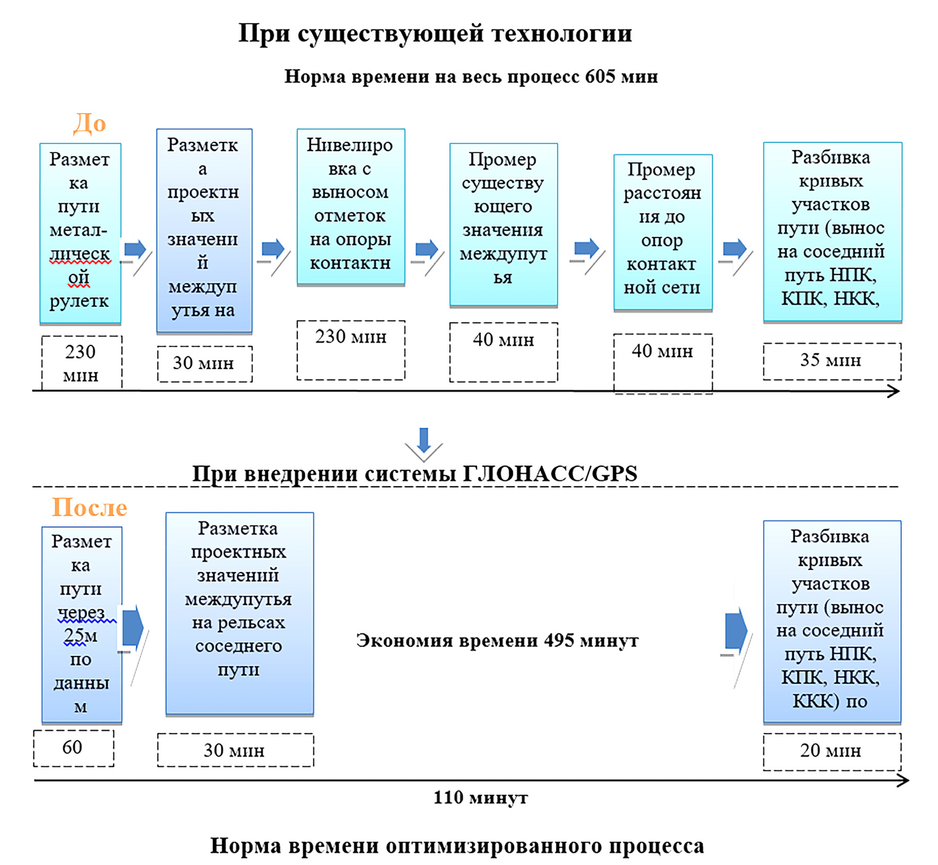 Исключительно важный ключевой показатель в процессе ремонта пути – это снижение времени производственного процесса для выполнения в полном объеме комплекса технологических операций и оценки добавления ценности создаваемого продукта труда. Имеется в виду рабочее время, и его отдельные стадии при проведении ремонта пути с использованием современных информационных систем и системы ГЛОНАСС [11].