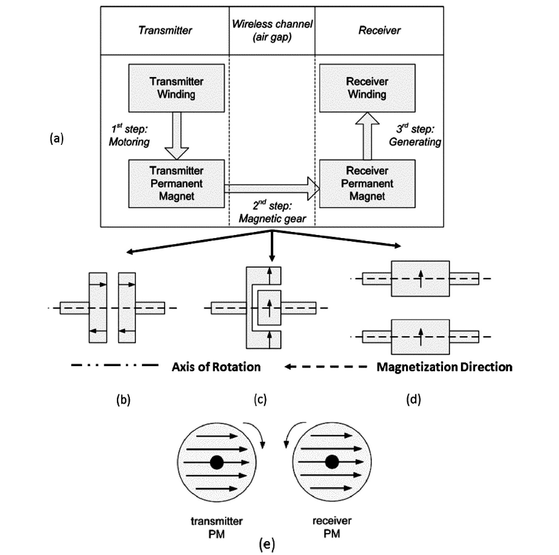 В исследовании [14] представлена диаграмма потока энергии (показанная на Рис. 1), иллюстрирующая механизм беспроводной передачи энергии и его реализацию. В указанном исследовании, кроме того, предложены три типа магнитной передачи, на Рис. 1(e) показана ориентация магнитного механизма. В случае передачи большой мощности муфта требует магнита большого размера, что значительно удорожает конструкцию.