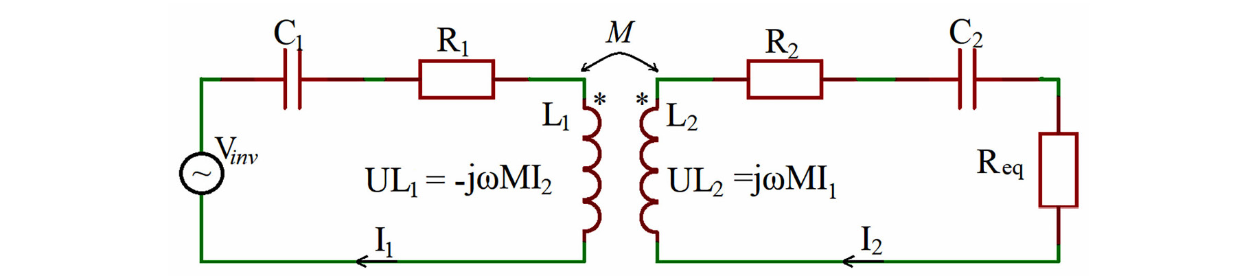Функциональную схему можно обозначить эквивалентной электрической схемой, представленной на Рис. 3. Источник синусоидального напряжения передатчика, Vinv, отражает основную составляющую выходного напряжения высокочастотного инвертора. I1 и I2 обозначают основные составляющие тока на концах передатчика и приемника соответственно. Нагрузку аккумулятора в сочетании со встроенным зарядным устройством (одноступенчатым или двухступенчатым) можно адекватно смоделировать, используя эквивалентное сопротивление Req.
