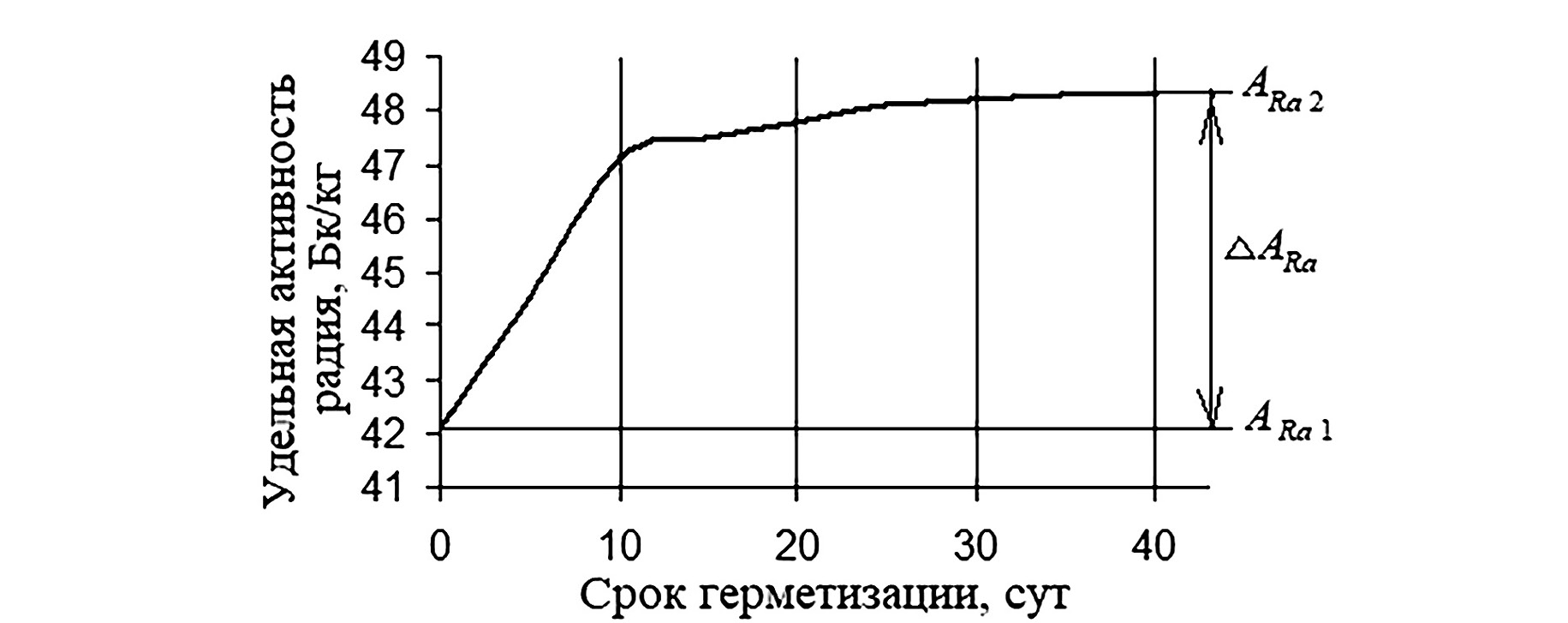 Fig. Specific activity of radium for calculating kem of the dump rock of the Cherkasskaya mine: АRa1 – specific activity of radium, measured in an aerated sample, Bq/kg; АRa2 – specific activity of radium, measured for a sealed sample after establishing radioactive equilibrium in the measuring container, Bq/kg