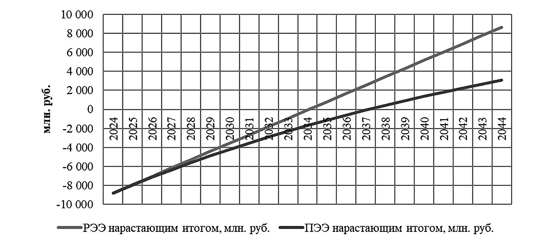 Рис. 2. Динамика финансовых показателей проекта при расчете по нижнему пределу общественного эффекта (РЭЭ – расчетный экономический эффект, ПЭЭ – приведенный экономический эффект)