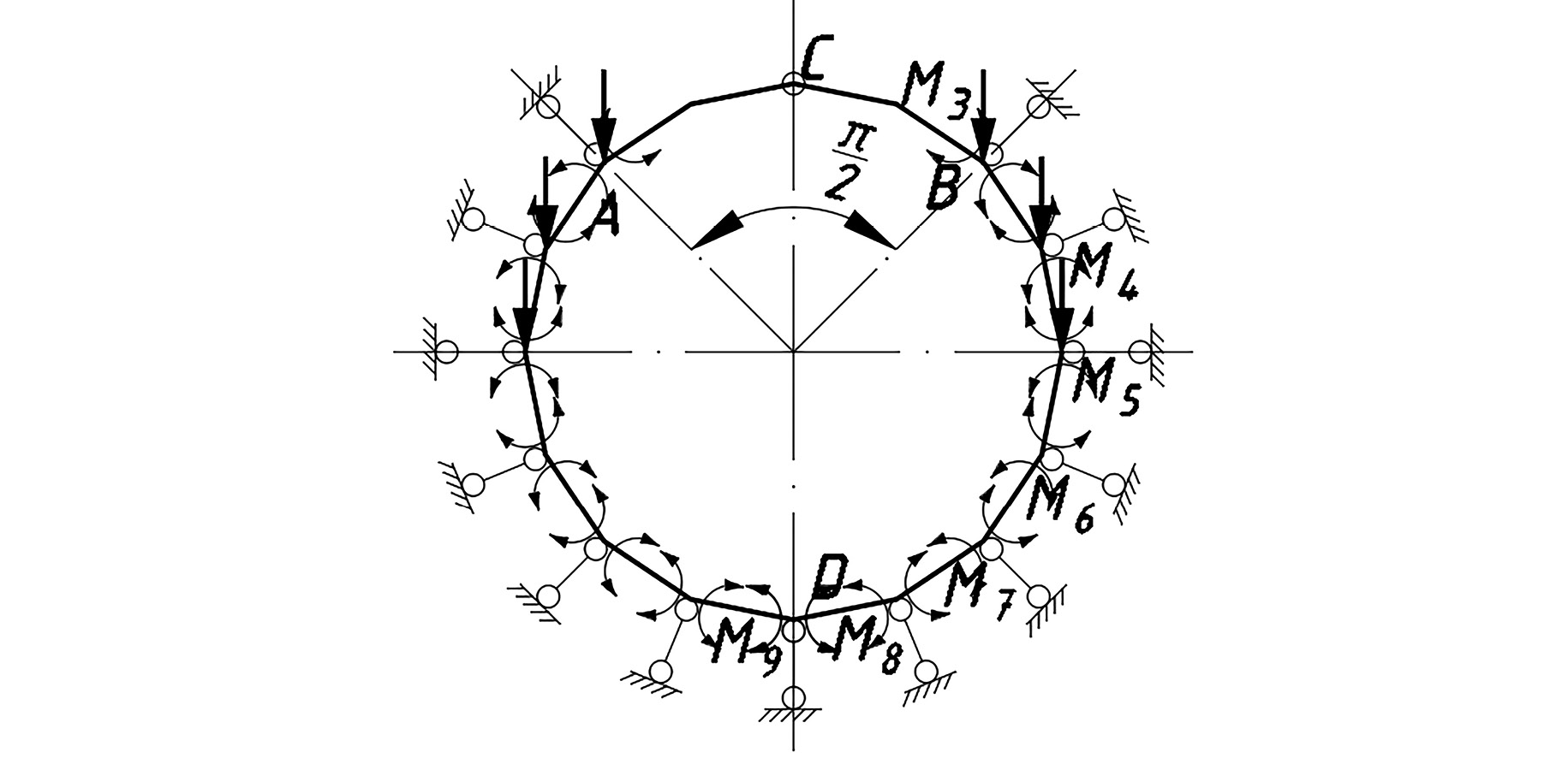 Распределенные нагрузки заменяются силами, приложенными к вершинам многоугольника. В результате такой замены геометрии сечения в верхних трех вершинах отсутствуют связи, образующие угол 90°, то есть зону, в которой отсутствует отпор грунта. При этом связи направлены к центру многоугольника, если в задаче не рассматривается сила трения грунта и обделки. Исследователями метростроя было предложено для удобства ведения расчетов рассматривать схему как трехшарнирную арку ACB и шарнирную цепь ADB.