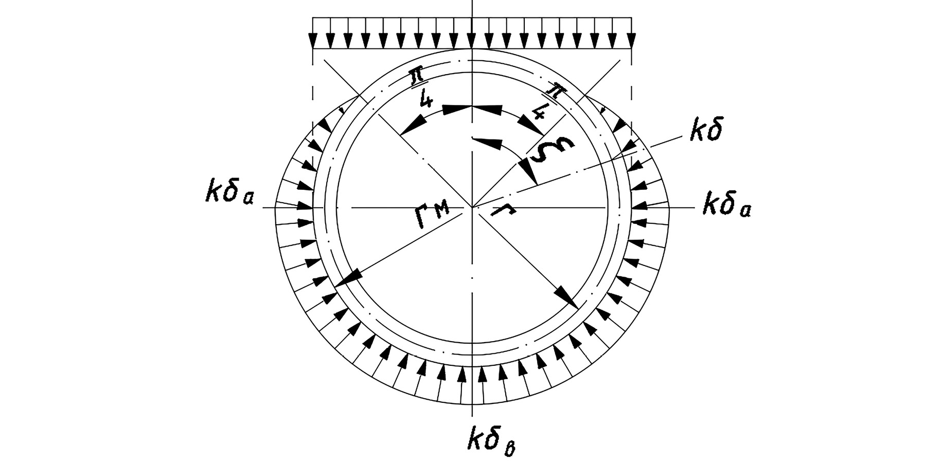 Метод О.Е. Бугаевой, разработанный для расчета обделок в том числе круглого очертания изложен подробно в работе [4] и также как методы Метростроя и Метрогипротранса основан на гипотезе отпора грунта Фусса-Винклера.
