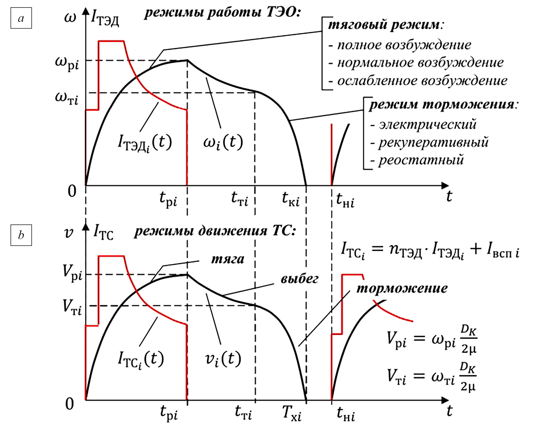 – продолжительность тягового режима (разгона) и время начала торможения на i-м перегоне; – максимальная скорость разгона и скорость начала торможения ТС на i-м перегоне, – угловая скорость вала ТЭД в конце разгона и начале торможения ТС на i-м перегоне соответственно, – время хода на i-м перегоне; , – кривые скорости и потребляемого тока ТС; – ток, потребляемый ТЭД; - число ТЭД в составе ТЭО ТС; – диаметр колеса ТС, μ – коэффициент передачи редуктора