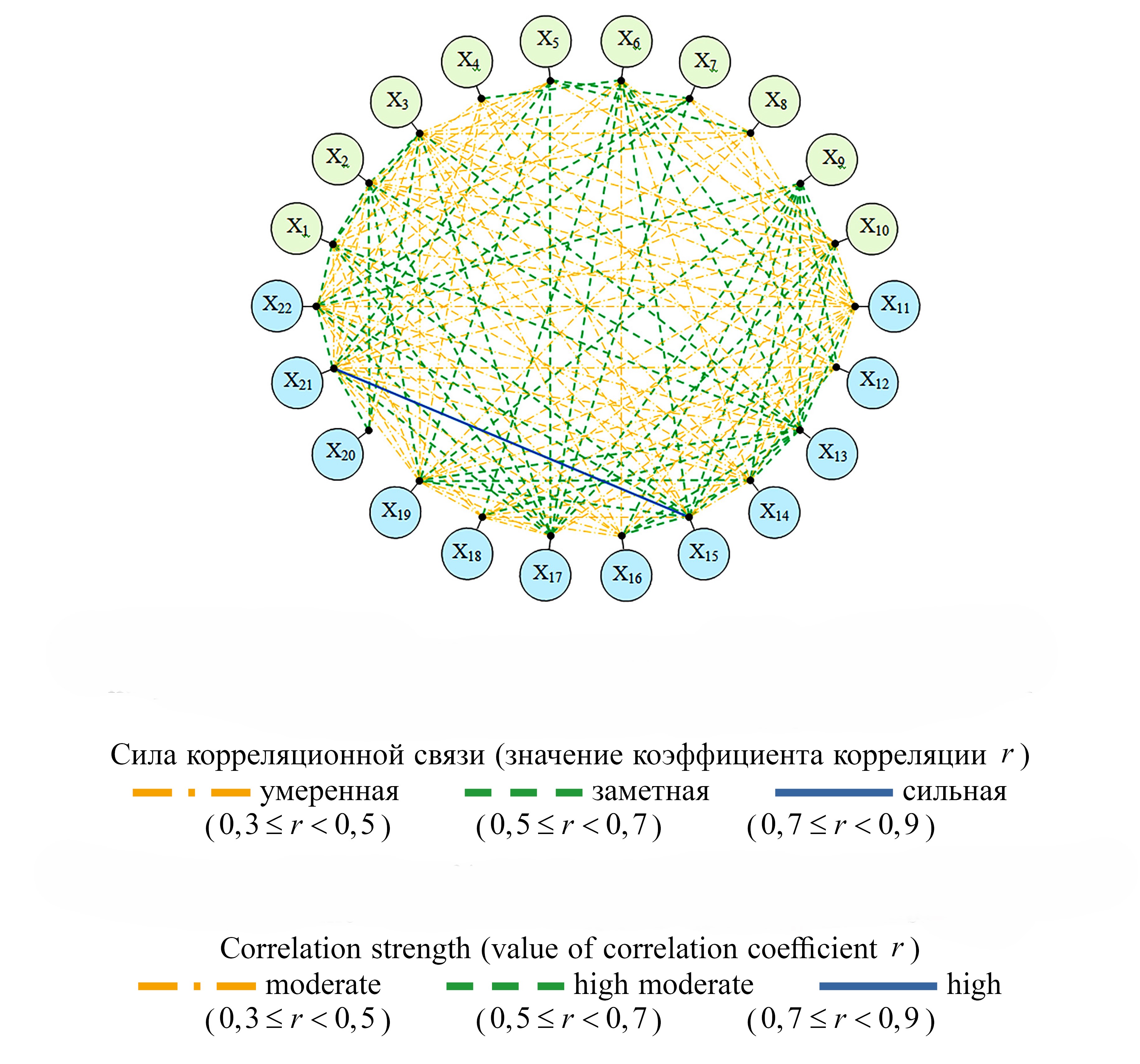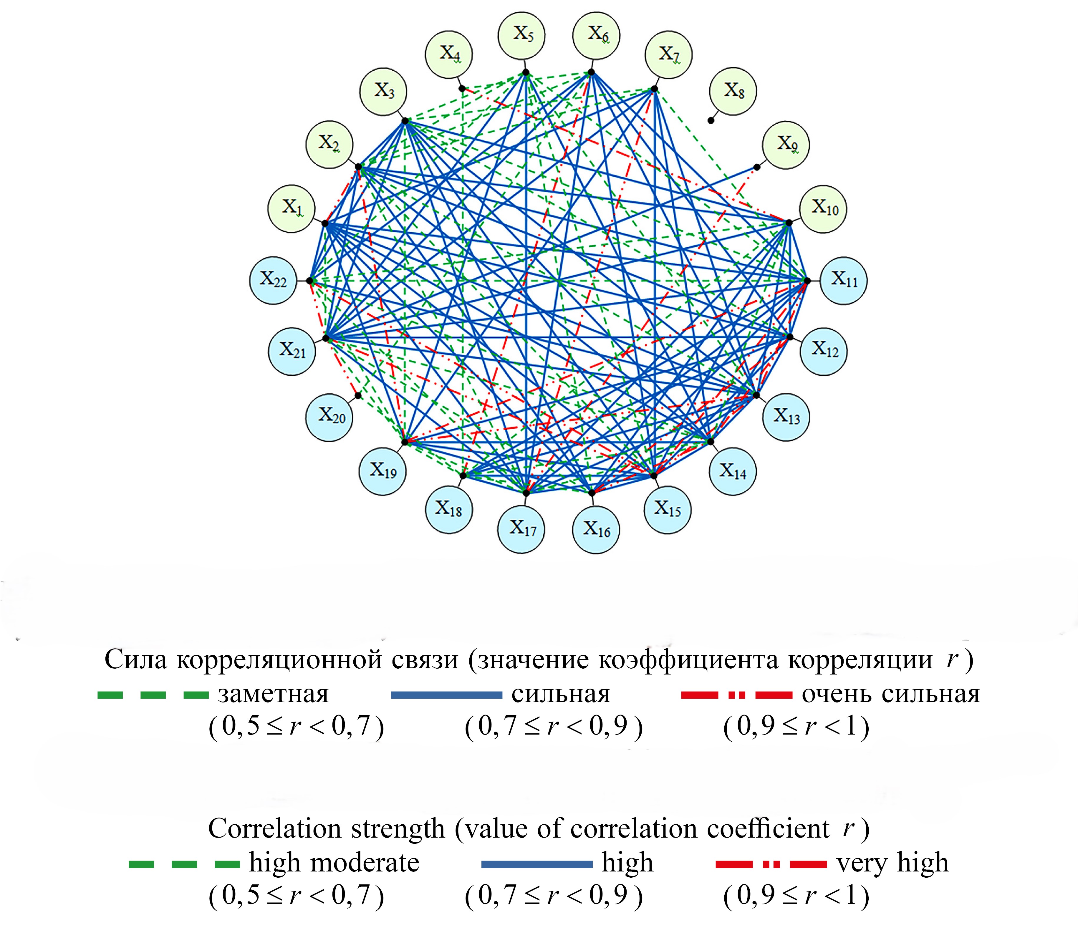 Дальнейший статистический анализ результатов экспериментального исследования подтвердил корреляционные связи между основными факторами, определяющими режимы эксплуатации ТС городского электрического транспорта и параметрами режимов работы электротехнического комплекса ТЭО. Результаты представлены на Рис. 3 в виде корреляционной плеяды взаимосвязей факторов X1-X22.