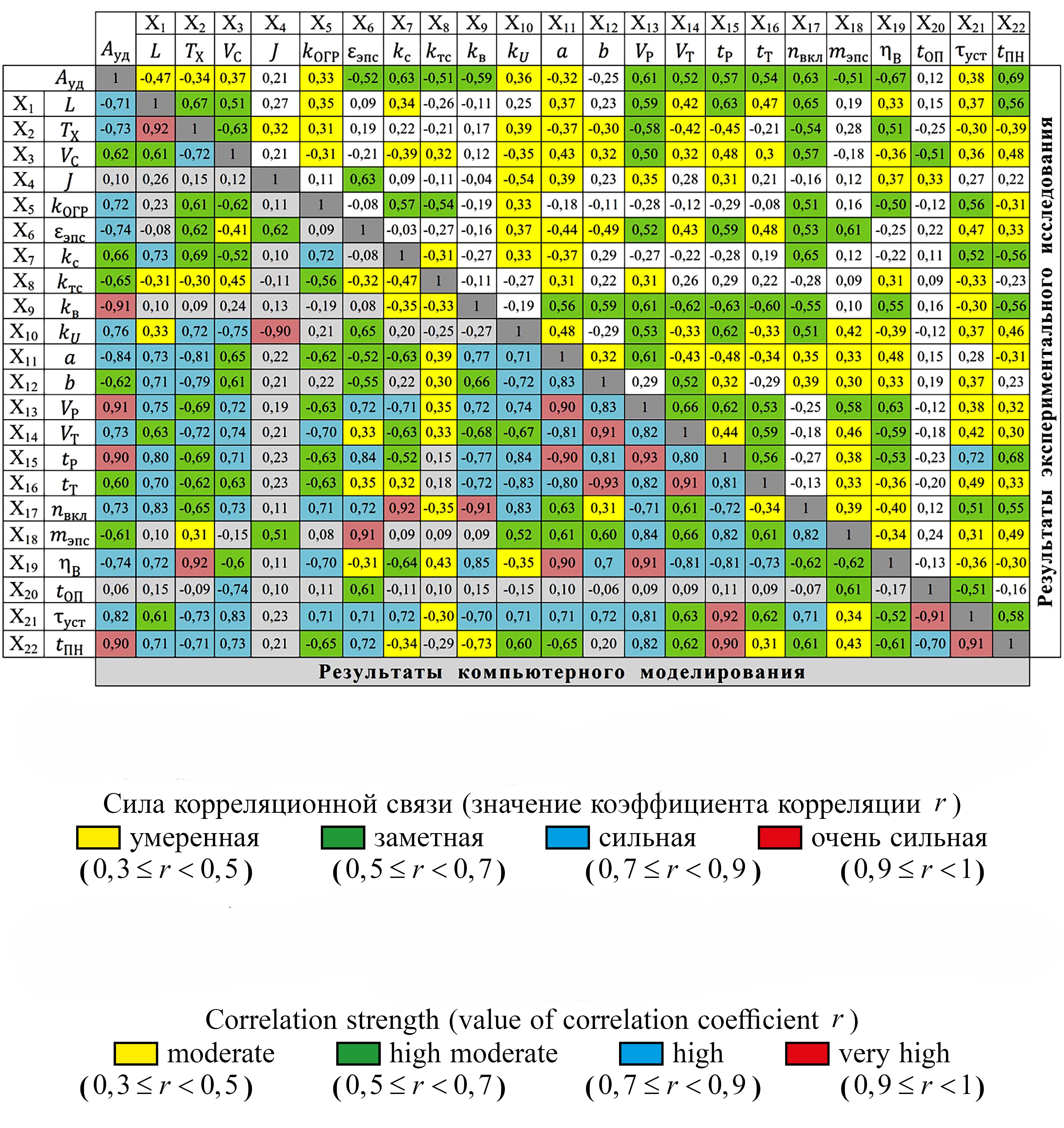 Числовые значения коэффициентов парных корреляций статистических факторов и величины удельного расхода электроэнергии , затрачиваемой на тягу ТС, представлены в виде матрицы на Рис. 4. При этом результаты компьютерного моделирования расположены ниже главной диагонали, результаты реального экспериментального исследования – выше.